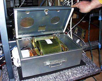 Au premier plan la boite en acier qui contient un auto-transformateur en tête d'alimentation secteur. |